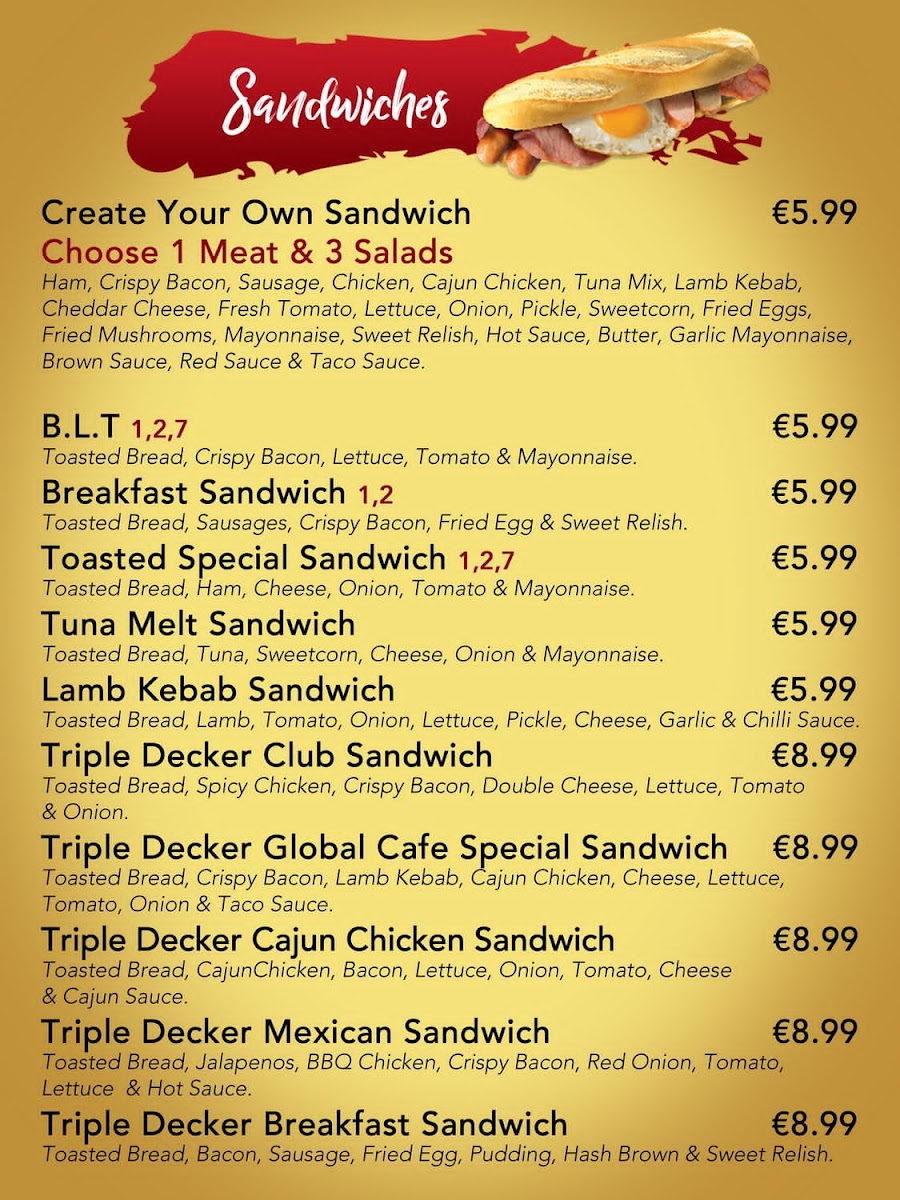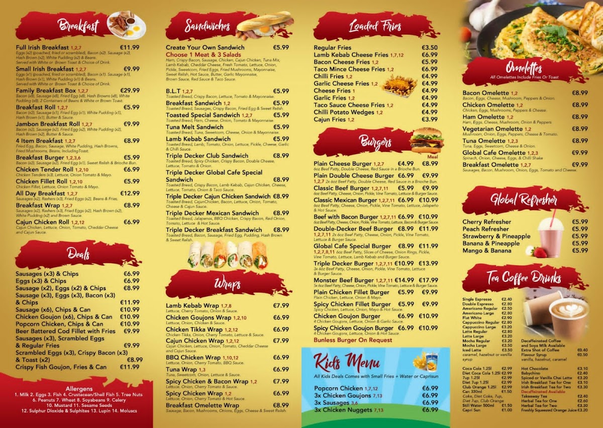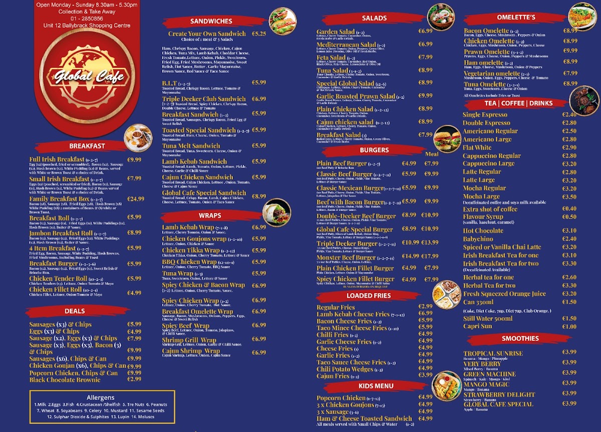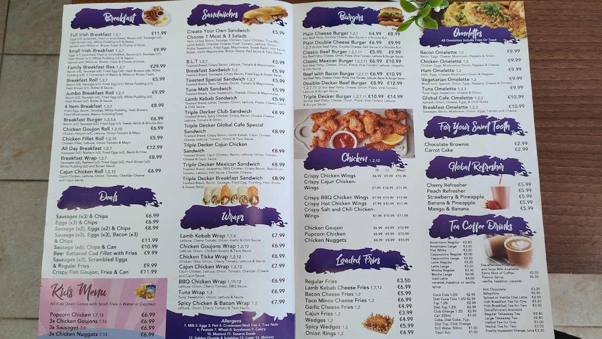 The menu at Global Cafe offers a variety of options suitable for different times of the day, including breakfast, light meals, and beverages. Available items include traditional breakfast dishes, as indicated by the presence of a Bacon Egg Sausage & Chips option, which suggests a focus on hearty morning meals.