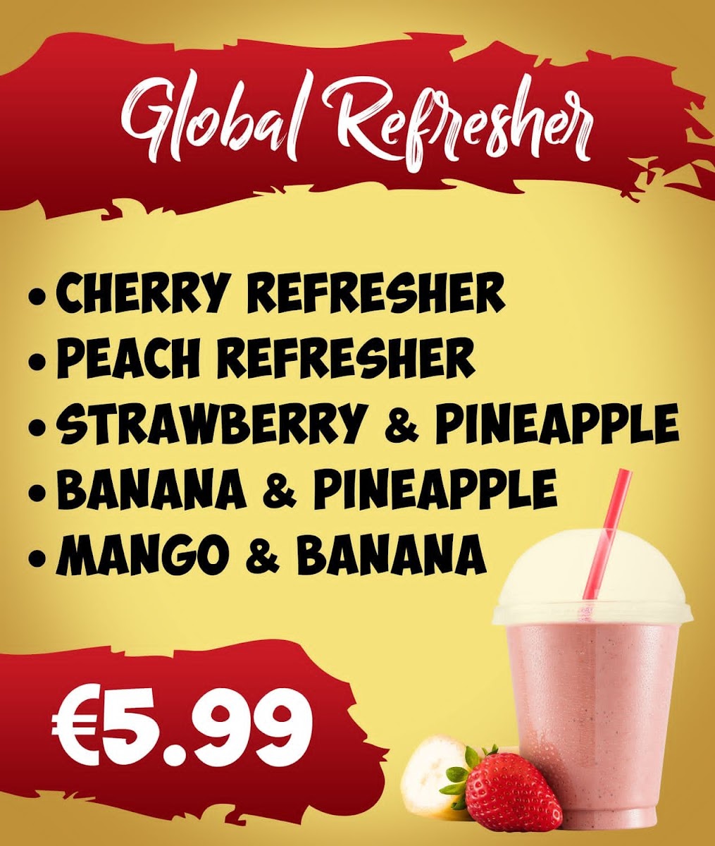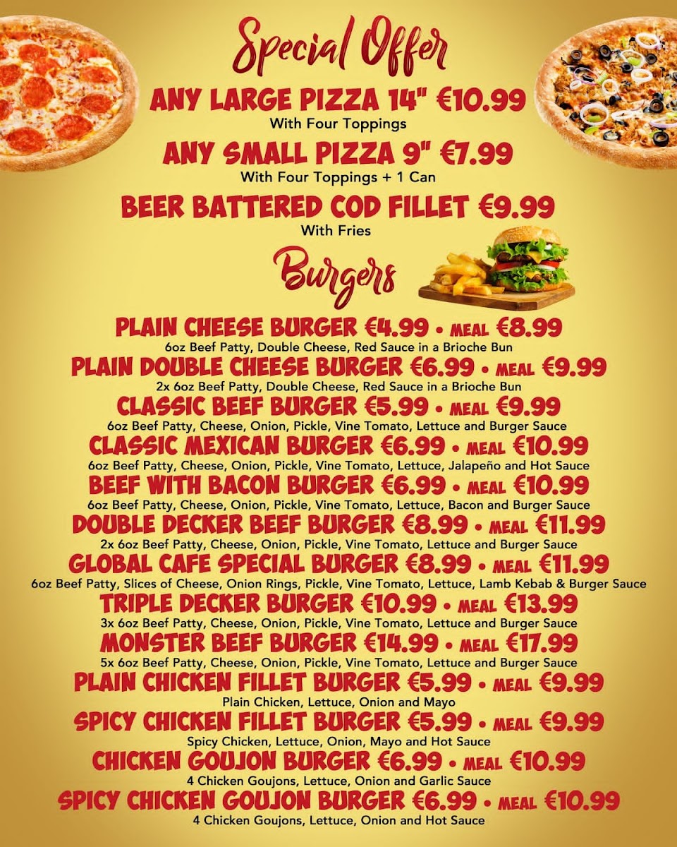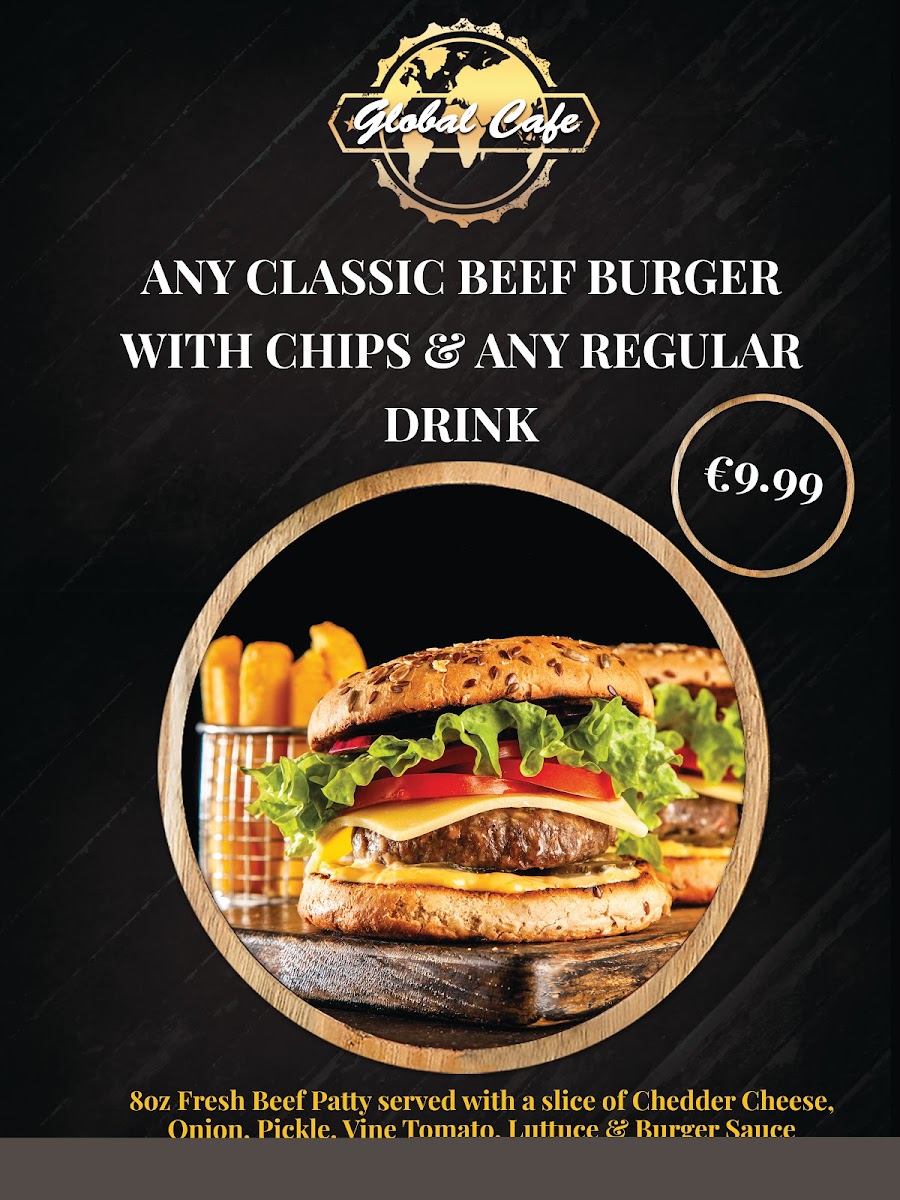 The menu at Global Cafe offers a variety of options suitable for different times of the day, including breakfast, light meals, and beverages. Available items include traditional breakfast dishes, as indicated by the presence of a Bacon Egg Sausage & Chips option, which suggests a focus on hearty morning meals.